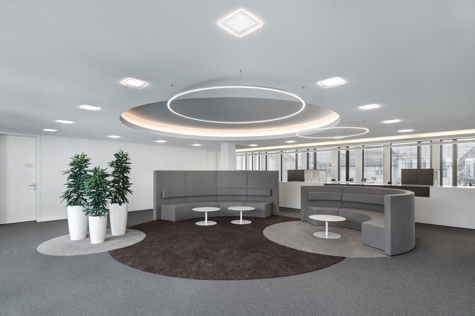 auf einer 2-geschossigen tiefgarage mit tresor- und nebenräumen empfängt der neue hauptsitz der donau-iller bank e.g. ihre kunden in ehingen. bedingt durch die räumlichen einschränkungen im vorherigen gebäude entwickelte sich der wunsch nach einem kompletten neubau, in dem alle zentralen dienste (und zugehörige mitarbeiter) untergebracht werden können. ein grosszügiger innenhof belichtet das gebäude und ergänzt die mechanische belüftung der arbeitsplätze.